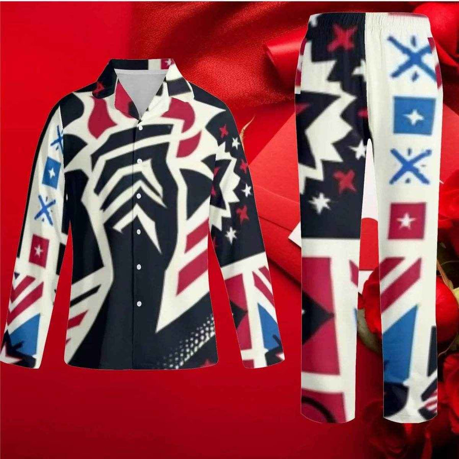 It features a relaxed-fit top with a classic button-front, paired with comfortable bottoms that have an adjustable waistband for a perfect fit.The Ultimate Patriotic Pajama SetThe striking design is a modern "stars and stripes" vision by artist Shadowseeker.
